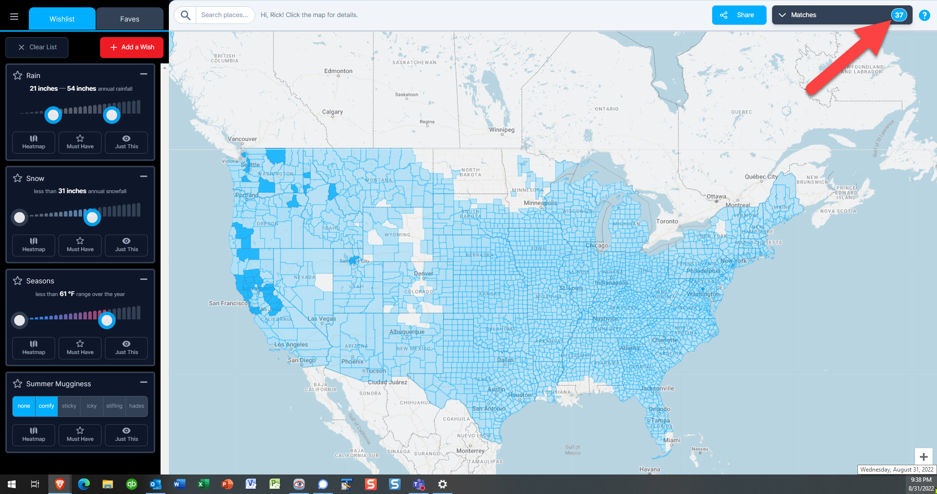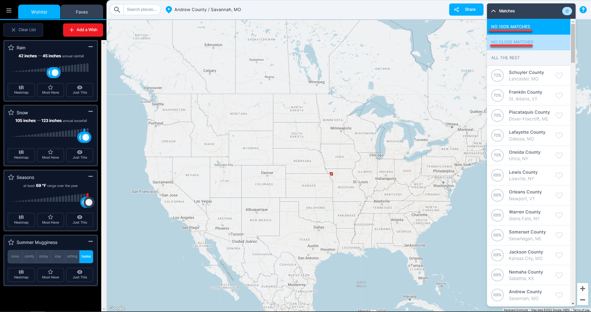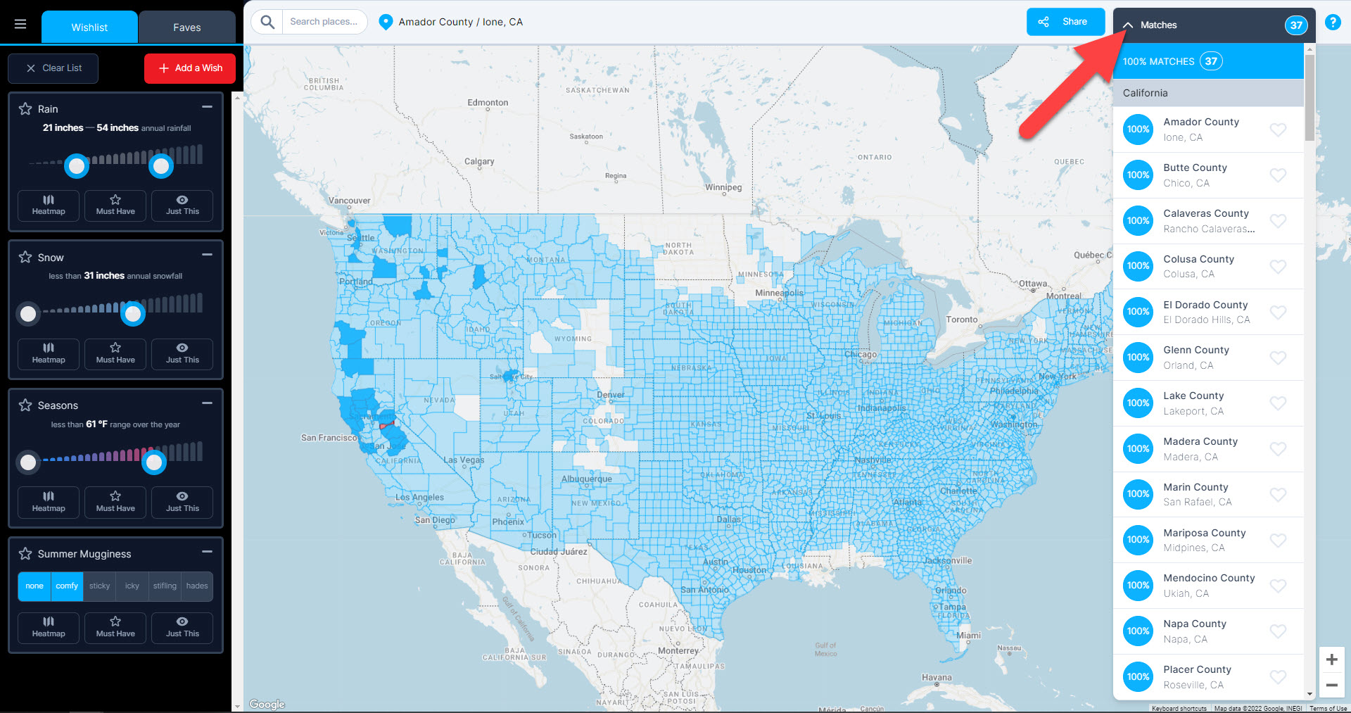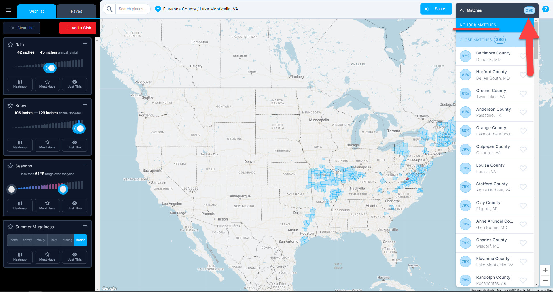 When a county doesn’t quite meet your wish, we determine how far it is from your need and assign a scale from 0 to 100% with our super-secret algorithm (think of it as artificial intelligence without the “artificial” part). 100% matches display counties in dark blue on the map. Close matches display in a faded blue in accordance with how closely they match your wishes. The count of 100% matches is displayed in the blue oval at the top right corner of the page.