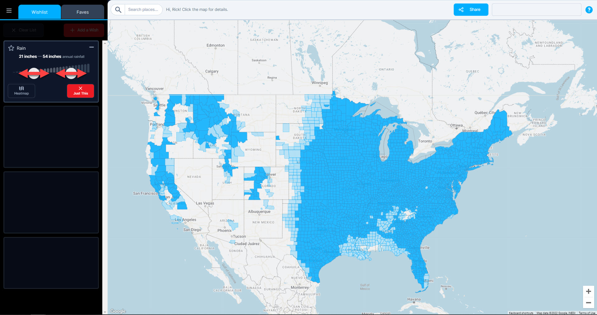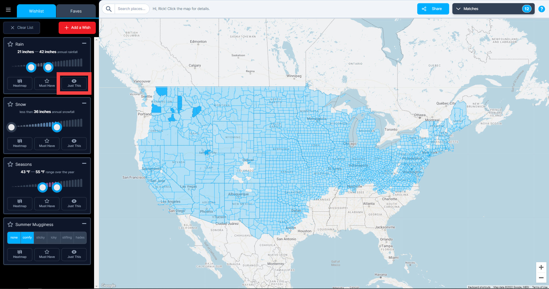 Unlike the heatmap, however, with the Just This button, you can dynamically change the map by moving the sliders or making other adjustments for your select category. That way, when, for example, you want more rain than where you live, but want less rain than Seattle (sorry, Seattle-ites, not trying to pick on you), you can adjust the sliders until your home county and Seattle are no longer highlighted.