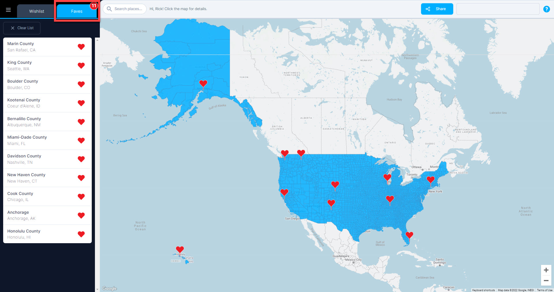 We keep track of all your Favorites under the Faves tab. From there, you can one-click to any of your favorite county profiles. You can click a heart (❤) to remove one county or use the "Clear List" button to clean your slate and start afresh.
