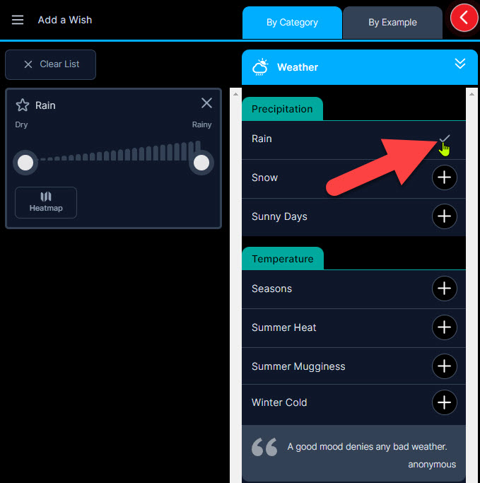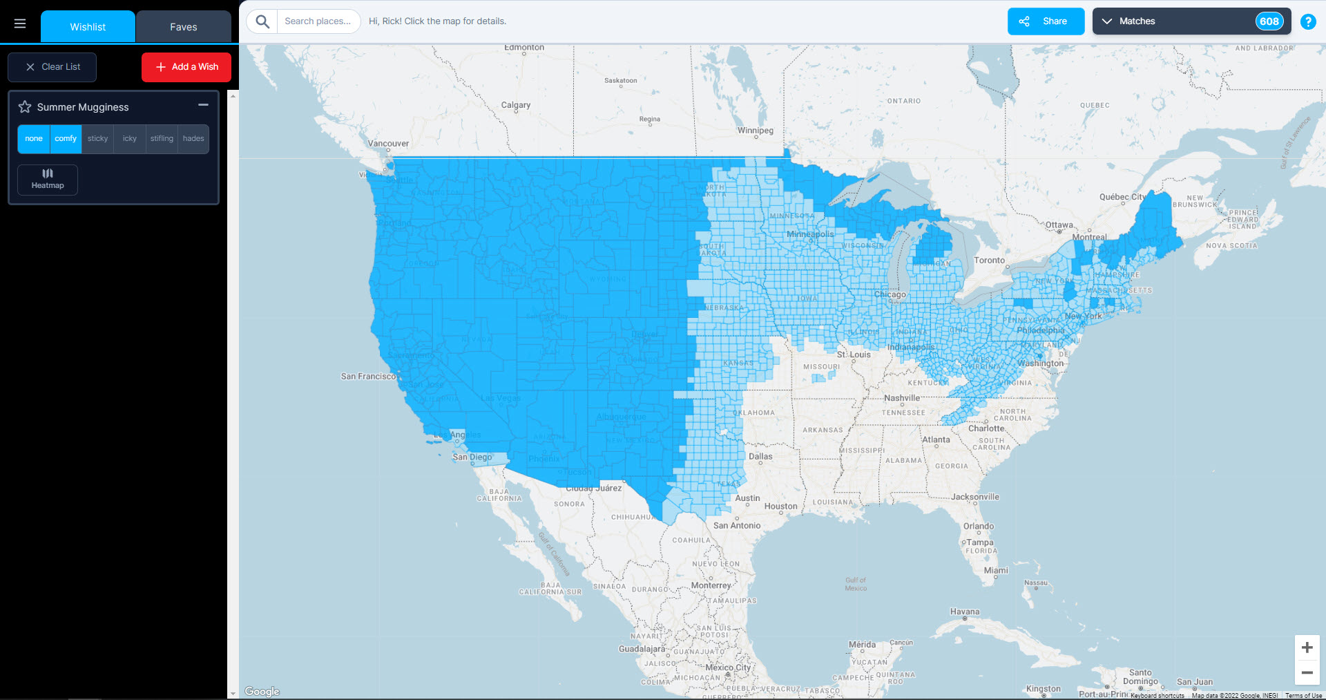 3. Not every control is a slider bar. Some allow a limited number of selection buttons. Such is the case for "Summer Mugginess" below. Simply select the conditions that match your wishes and the map will dynamically update.