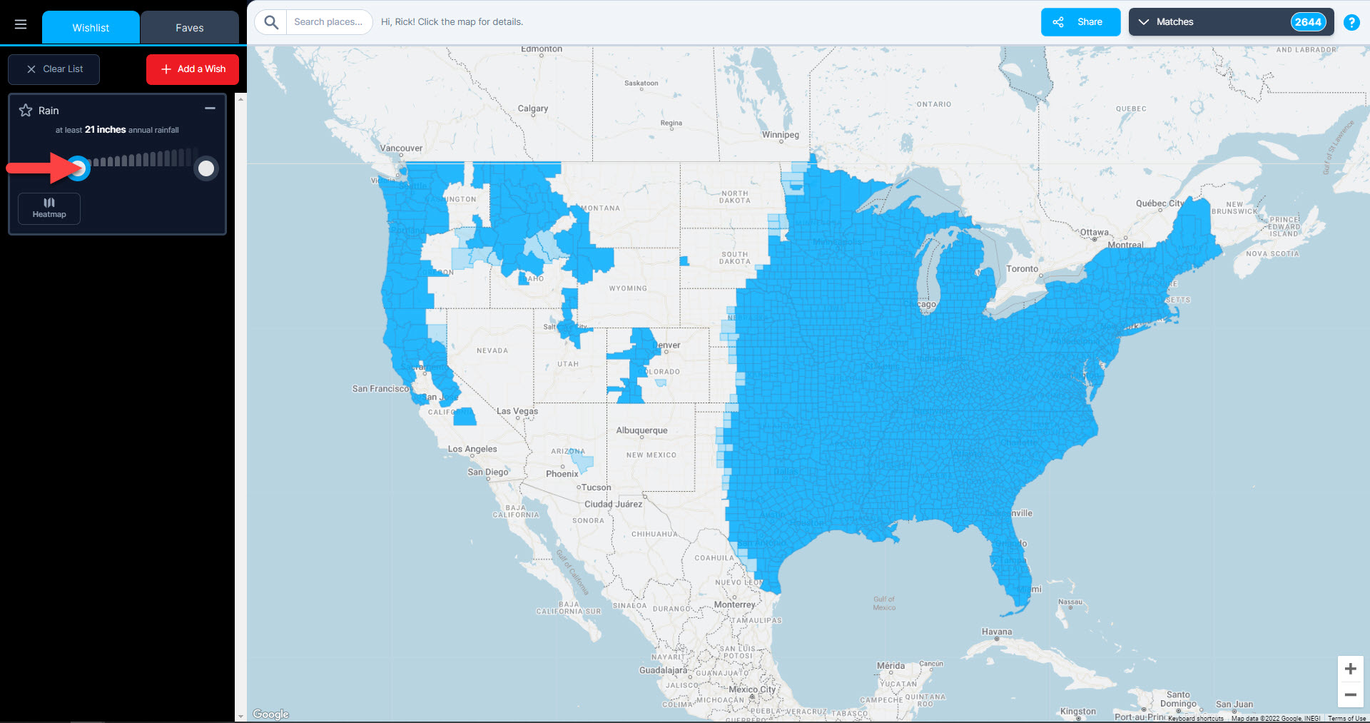 2. Simply move one of the slider controls left or right to activate the category. As you move the slider, you will notice the map change along with the number of counties matching your criteria. Counties that fail to meet your criteria are no longer dark blue. Those that are close to your requirement are lighter blue in color. As you change the slider setting or add new category requirements, the number of matching counties will continually shrink.