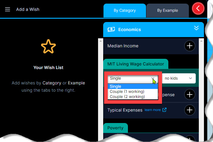 4. One of the more complex controls is tied to the MIT Living Wage Calculator. For the data to make sense for your situation, you'll need to input your conditions as either single or married, one or two working, and the number of children. .