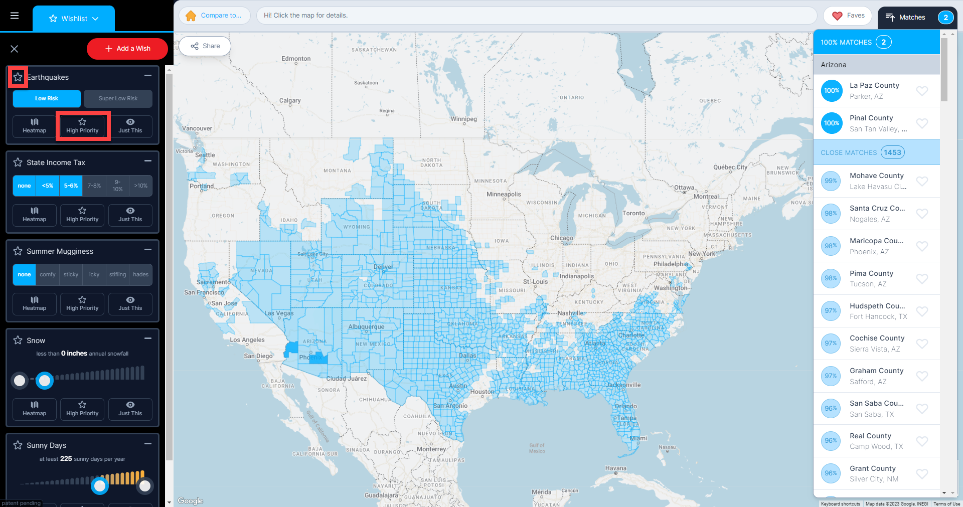 To make sure those non-negotiables are considered, simply select either the "High Priority" button or the Star symbol for the wishes you want to be elevated in importance. Both buttons do the same thing. They amplify the weighting (importance) of those wishes relative to the others.