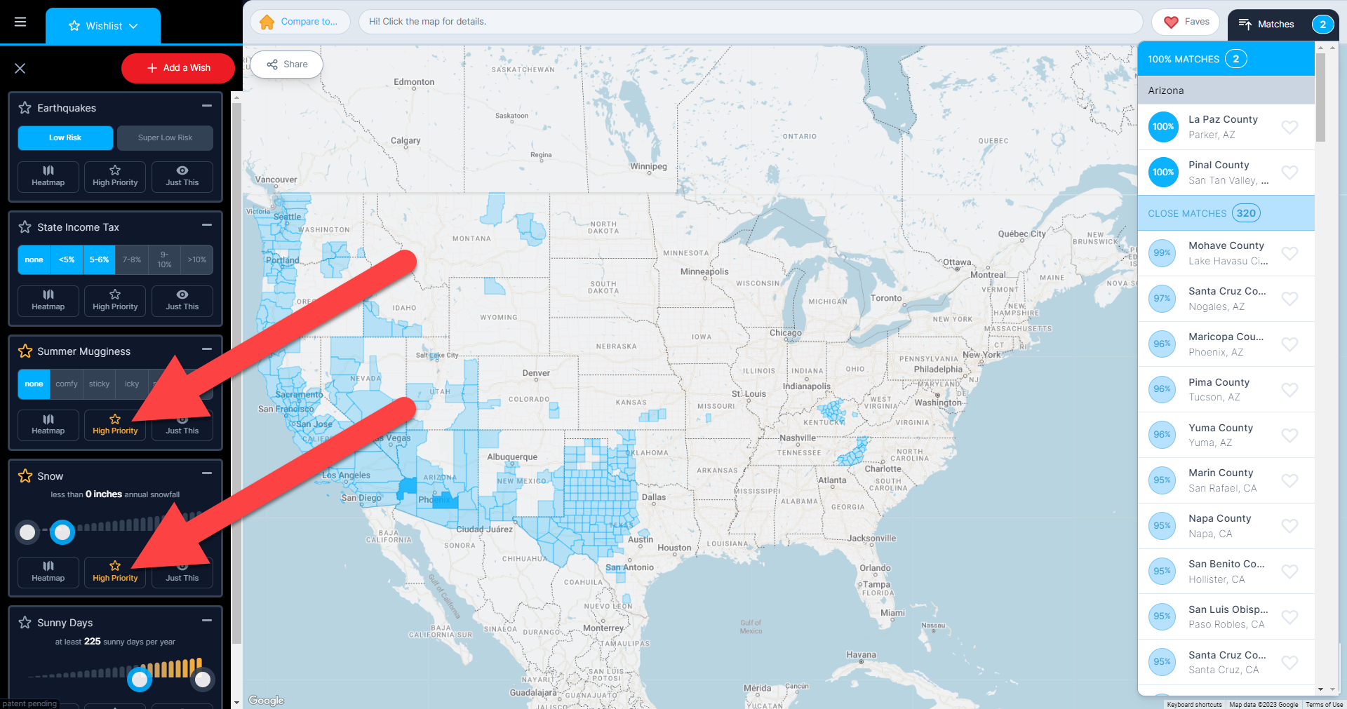 When you activate the "High Priority" feature for Summer Mugginess and Snow, notice how all the Rocky Mountain (snow) locations and the Florida/Gulf Coast (summer mugginess) regions are no longer close matches.